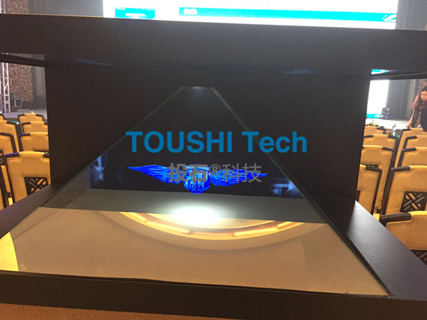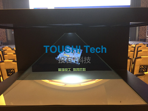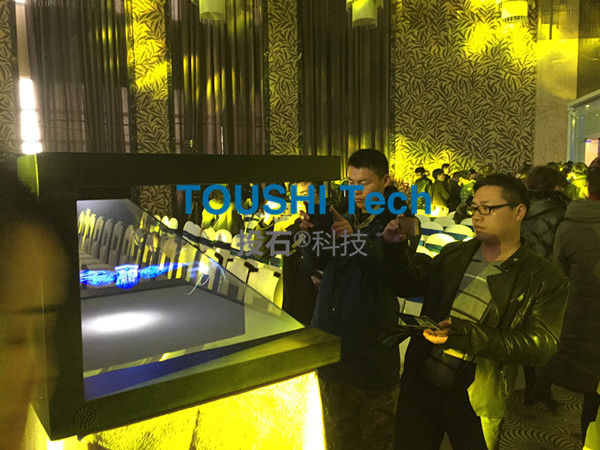 投石通過(guò)三維建模,將音像裝置置于金字塔成像幕頂部,影像通過(guò)折射從而在正金字塔形成像幕中呈現(xiàn)幻象。三維影像直接懸浮在空中,房展會(huì)中的樣板房以三維影像呈現(xiàn),讓人們無(wú)需佩戴眼鏡便可觀看3D視效,空間感、立體感極強(qiáng)。當(dāng)參觀者站在270全息柜前,可以多角度的參觀樣板房,身臨其近。