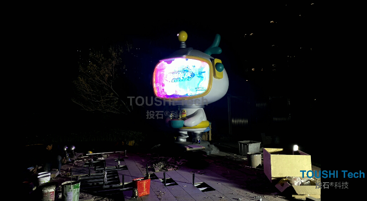 投石智能系統(tǒng)這款紅外感應(yīng)自動(dòng)講解LED雕塑互動(dòng)裝置的屏幕是曲面屏幕設(shè)計(jì),尺寸為6平米大小。(定制化產(chǎn)品)