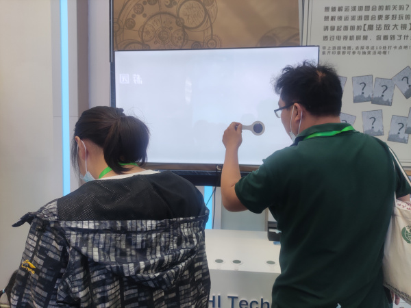 這塊白屏,看似平淡無奇,沒有任何畫面,無任何特別之處,可就當(dāng)體驗(yàn)者拿著魔法眼鏡裝置對(duì)著白屏,神奇的事情就會(huì)發(fā)生,鏡面照到的地方就會(huì)有神奇的動(dòng)態(tài)畫面出現(xiàn)。這是投石智能系統(tǒng)未來之眼魔法眼鏡裝置,其尺寸大小,顏色外觀造型皆可包裝定制。 圖:觀眾體驗(yàn)未來之眼魔法眼鏡裝置 在整個(gè)展會(huì)中,還有很多高科技產(chǎn)品,像投石這款體感粒子特色交互裝置,影隨我動(dòng),不同的風(fēng)格互動(dòng)起來的展現(xiàn)形式也是千變?nèi)f化。當(dāng)觀眾經(jīng)過這個(gè)裝置的時(shí)候,作品畫面上的水與墨粒子會(huì)隨著觀眾移動(dòng)的快慢、人數(shù)多少的感應(yīng)而產(chǎn)生流動(dòng)和變化,畫面也會(huì)變得更為有趣。 圖:觀眾體驗(yàn)數(shù)字化文博展示,體感粒子特色交互