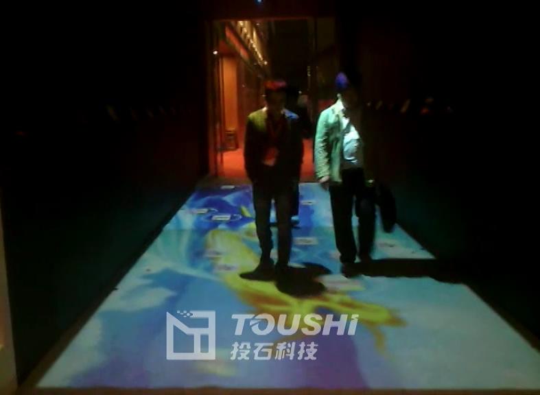 2012年4月,南京投石智能系統(tǒng)有限公司為于2012年4月6日在南京國(guó)際博覽中心舉行的聯(lián)想2012年經(jīng)銷商大會(huì)提供2通道地面互動(dòng)投影服務(wù)。本展示區(qū)域用于展示聯(lián)想公司的LOGO以及筆記本、PAD等電子產(chǎn)品,當(dāng)頂部紅外感應(yīng)攝像機(jī)感應(yīng)到區(qū)域內(nèi)有人走入投影到地面上的畫面時(shí),畫面效果發(fā)生變化,人離開(kāi)后,虛擬的投影畫面恢復(fù)初始動(dòng)態(tài)效果