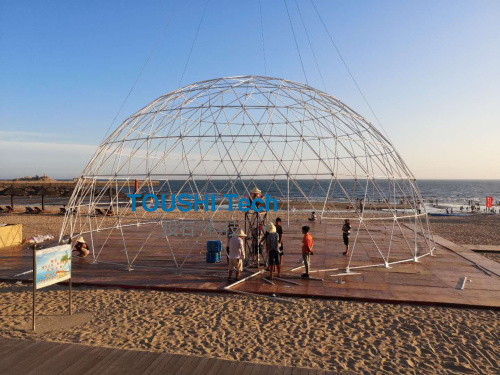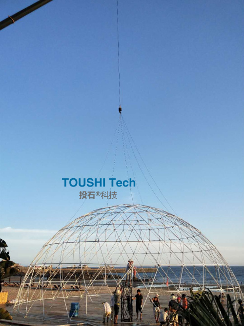 360戶外球幕球體主結(jié)構(gòu)采用合金鋼管標(biāo)準(zhǔn)件拼裝構(gòu)成,球體直徑20米,高9米的半球體采用PVC篷布里外覆蓋,所有材料均達(dá)到防火B(yǎng)1級(jí)標(biāo)準(zhǔn),設(shè)有兩個(gè)安全出入口,外層覆蓋幕布整體吊裝完成,球體鋼架現(xiàn)場(chǎng)拼裝,拼裝時(shí)間短,安全快捷,球體周邊有固定碼,即保證球體安全抗風(fēng)能力,又不影響原地面基層設(shè)施。