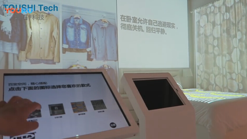 這次的南京宜家全屋設(shè)計(jì)體驗(yàn)中心分為2塊,一是家居模型投影,由4臺(tái)投影機(jī)、1臺(tái)電腦主機(jī),1臺(tái)19寸觸摸一體機(jī)組成,投影區(qū)域主要有櫥柜,床,窗簾以及墻壁??蛻艨梢酝ㄟ^觸摸一體機(jī)選擇自己喜歡的樣式搭配,投影結(jié)合模型呈現(xiàn)裸眼3d。虛實(shí)結(jié)合,實(shí)現(xiàn)裸眼3D。