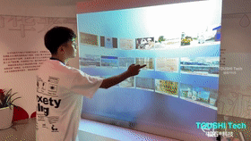 在展廳內(nèi),投石智能系統(tǒng)為“衛(wèi)崗,全新未來”主題提供了全息投影互動裝置,主要由65寸玻璃觸摸膜組成。內(nèi)容包含[品牌概述]-[品牌大事件]-[品牌歷史時間軸]-[品牌畫冊]四大塊。