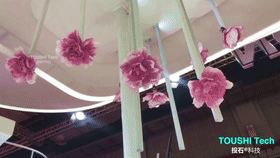 2020進博會獅王展位在空間的不同區(qū)域設置了8朵機械花開裝置,分別是直徑50cm和直徑30cm各4朵。為了滿足上海進博會對材質的防火要求,投石智能系統(tǒng)特地采用進口阻燃紙作為開合的花瓣材質,通過防火和染色、機械控制三道工序,實現了難燃性的防火要求。