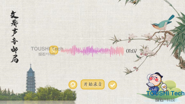 當(dāng)用戶掃描對應(yīng)二維碼后,進入對應(yīng)h5界面,界面會出現(xiàn)對應(yīng)背景圖片和用戶錄音文件,用戶可以伴隨對應(yīng)畫面聽到當(dāng)時錄入的聲音,還可以通過分享界面分享給友人,共同聆聽。投石智能系統(tǒng)文學(xué)之都展廳聲音郵局歡迎每一個熱愛南京的你。