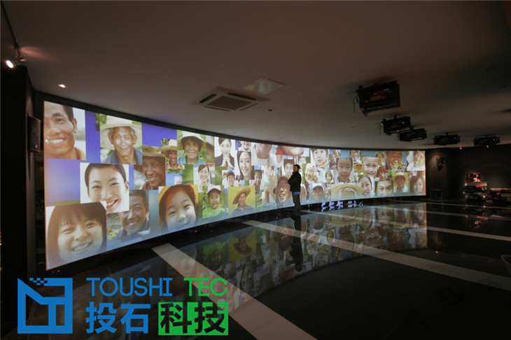 環(huán)幕投影和多通道融合校正是一種時下流行的大型顯示技術(shù),表現(xiàn)場景宏偉,氣勢磅礴。在環(huán)形或者各類弧形幕布上投影豐富多彩的多媒體內(nèi)容。在環(huán)形基礎(chǔ)上還可以加入觸控或者互動功能。投石可以提供120度,270度,360度等各類弧度的環(huán)幕。也可以定制不規(guī)則環(huán)形。