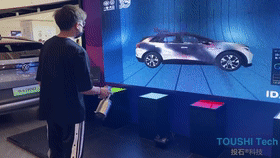 南京車管所榮威汽車凌空噴漆涂鴉互動裝置案例中顏色取色換色是體驗者拿著模型槍對著屏幕里進行虛擬取色更換。