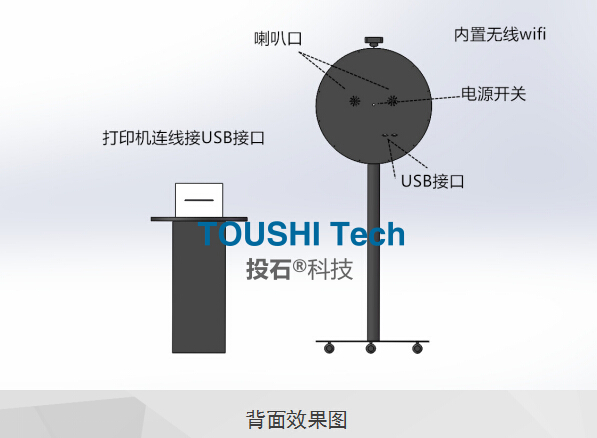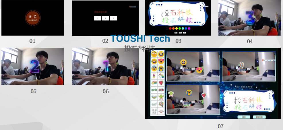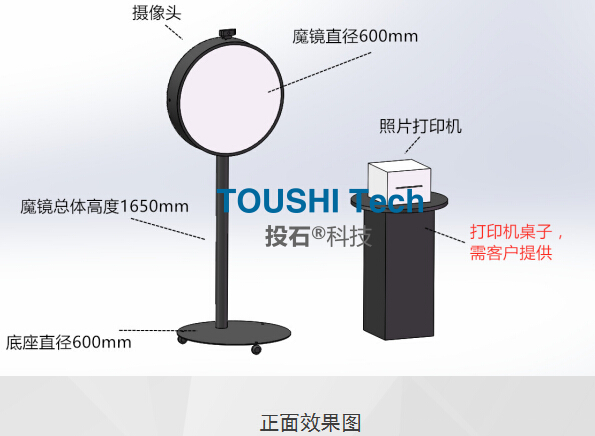 從活動策劃角度出發(fā),魔鏡拍照互動裝置不需要占用太大的空間,只需要平時家里鏡子大小的空間。鏡面屏幕是一個極具特色的交互形式,利用鏡面反光以及黑底過濾的特性,熄屏狀態(tài)呈現(xiàn)出鏡子原本的樣貌,有顯示內(nèi)容的時候,又能過濾黑底,呈現(xiàn)一種透明的狀態(tài)。投石智能系統(tǒng)的魔鏡拍照互動裝置不僅投合女性體驗者熱衷自拍、愛美的喜好,而且結(jié)合了各種潮流時尚元素,這也是該產(chǎn)品在國內(nèi)外受到廣泛關(guān)注的關(guān)鍵。對于策劃而言,活動舉辦的成功取決于體驗者參與時對活動的認(rèn)同,魔鏡拍照互動裝置不僅邀請體驗者參與活動流程,并且打印生成的實體照片能夠作為活動參與的紀(jì)念品給體驗者留念,在體驗者留念的同時也極大地宣揚了活動的廣泛傳播,具有良好的廣告效應(yīng)。 產(chǎn)品硬件裝置: