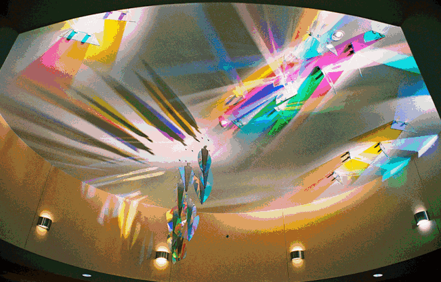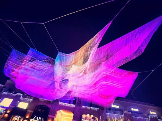 2017年,美國藝術(shù)家珍妮特·艾克曼(Janet Echelman)在北京藍(lán)色港灣帶來了名為《1.8》的作品。通過藝術(shù)與技術(shù)的結(jié)合,以彩色網(wǎng)狀結(jié)構(gòu)在空中搭建巨大的漂浮作品。