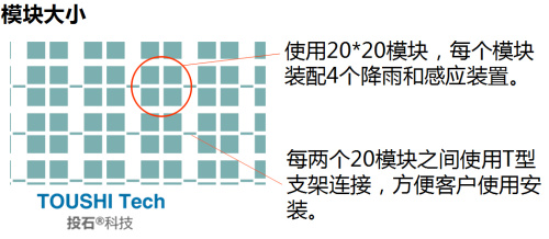 使用20*20模塊,每個模塊裝配4個降雨和感應(yīng)裝置。