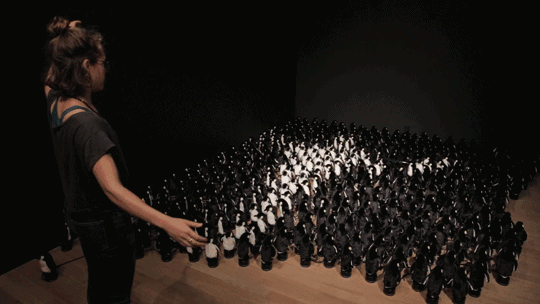 由448只會旋轉(zhuǎn)的機(jī)器企鵝所組成。利用企鵝腹背黑白顏色的對比,互動者只要站在裝置前面動作,可愛的企鵝們就會跟隨影子互動,進(jìn)而將互動者的動作排列出來,真的是太可愛了!