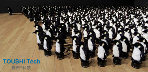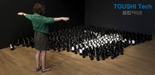 投石智能系統(tǒng)體感企鵝矩陣交互裝置大致由三個(gè)部分構(gòu)成:輸入(感應(yīng)器)、處理(控制器)和輸出(表現(xiàn)器)。整體設(shè)備尺寸是3×2.1米,企鵝及電機(jī)組448組,每個(gè)毛絨企鵝16cm高。