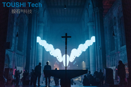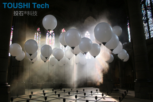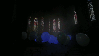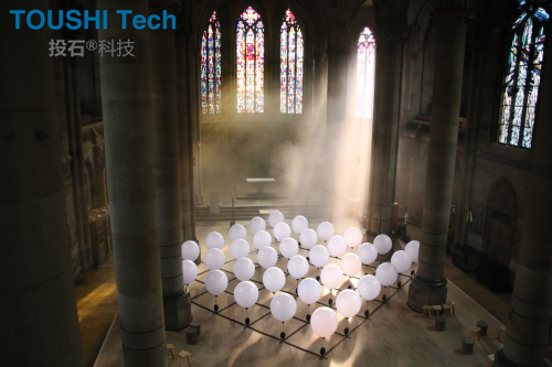 看似失重的氦氣球伴隨著音樂,有規(guī)律地在空中舞動,以極富詩意的方式照亮了整個空間,將斯圖加特雄偉的圣瑪利亞教堂變成了一個藝術舞臺。