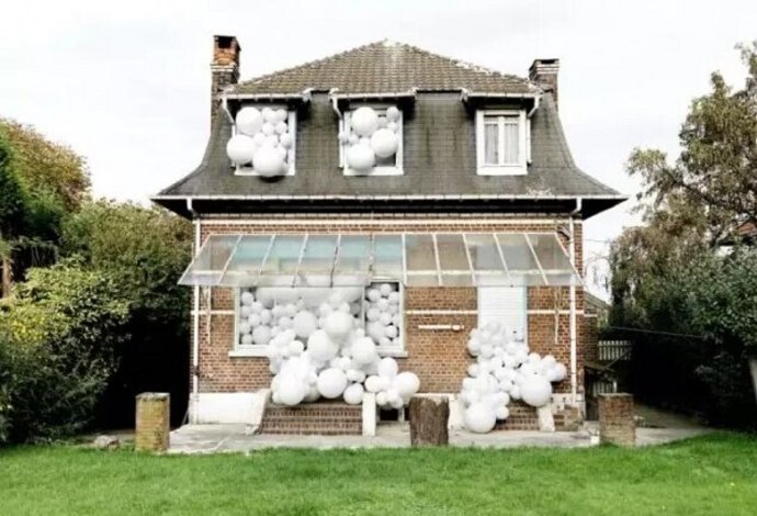 將大量白色的充氣氣球放在了房子、社區(qū)和自然景觀整個畫面就匯集成了一件不錯的藝術裝置:氣球從破舊古老的木質房屋、從兩棟樓之間、從一輛破舊的車中......白色的氣球裝置將這些破舊的容器入侵,填充,這種強烈的新舊和突兀感讓畫面顯得特別的美。