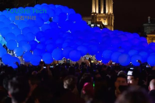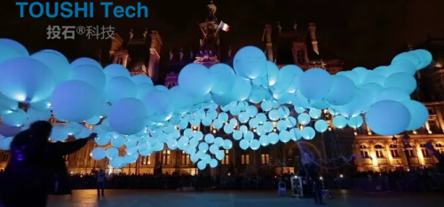 藝術裝置除了能夠自由懸浮在空中自定義發(fā)光外,在夜間,這些LED燈通過遠處的遙控器操作控制,任何一個參與者,都可以通過手中的app去控制燈光的顏色效果變化。為法國的夜間藝術慶祝著,形成一個創(chuàng)新的,富有詩意的互動游樂場,給了人們親身去體驗這個神奇氣球裝置的機會。