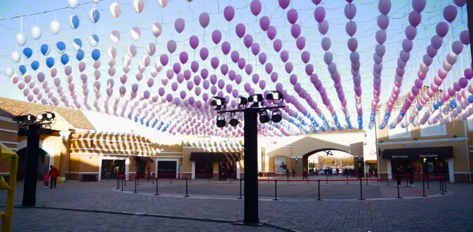 這款唯美的氣球名叫「回音氣球」,是為北京斯普瑞斯奧特萊斯定制的藝術裝置,在一個30米直徑的大圓空間里,899個PE材質的定制氣球懸掛在6米高的空中,每個氣球懸掛高矮不一,形成了一種波浪曲線的效果。