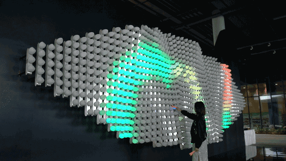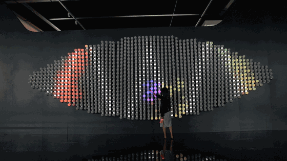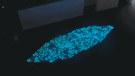 裝置主體由1300個水滴形狀感應(yīng)式燈組成,排列成波浪起伏的表面。當(dāng)參與者用發(fā)光的物體靠近其中一顆“水滴”時,它會立即被點亮,并將這一點光傳遞給周圍的“水滴”。一道看得見的“光波”隨之一直延展到裝置的邊緣,如同你在湖水中投入一粒石子引起的漣漪。