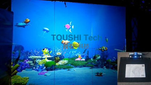 利用多媒體營造一個虛擬的水族箱,“箱內(nèi)”的魚兒不再只是自己游動,而會和小朋友一起互動。玩法:小朋友觸碰水族箱,小魚便會有反應(yīng)。