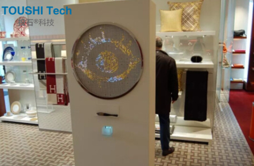 愛馬仕與Le Jour品牌香水的發(fā)布展上,一塊水感LED燈光面板,一張女人的臉龐,好似春風(fēng)拂面般轉(zhuǎn)動著。通過光影手段突出愛馬仕香水獨有高雅的氣息和經(jīng)典的品質(zhì),與現(xiàn)場的產(chǎn)品和格調(diào)融為一體。
