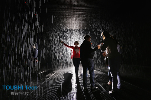 以數(shù)字三維和計算機3D感應(yīng)技術(shù)為基礎(chǔ),雨屋在對自然致敬的同時,通過人與機器的互動,讓“下雨”這個凡常的自然現(xiàn)象,擁有了一種超現(xiàn)實的色彩。而這也是一種別樣的方式,讓你在雨落和雨停、雨水在場與不在場之間,真切地感受到“身體”的存在。