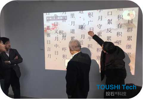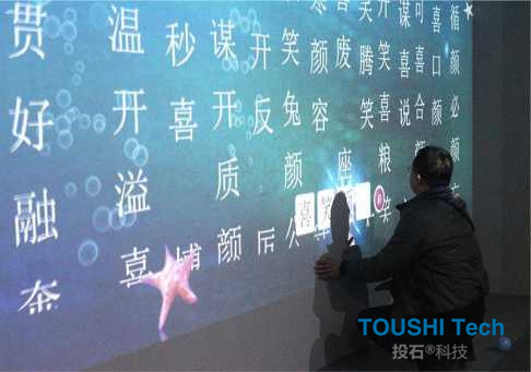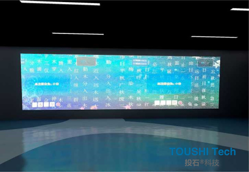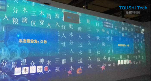 將漢字與成語(yǔ)文化,通過(guò)游戲的形式展示出來(lái)。參與者通過(guò)與投影畫(huà)面互動(dòng),將分散的漢字零件拼湊起來(lái),將飄落的文字組成正確的成語(yǔ)。這就是投石AR互動(dòng)成語(yǔ)墻。