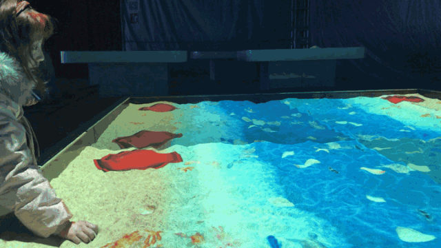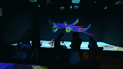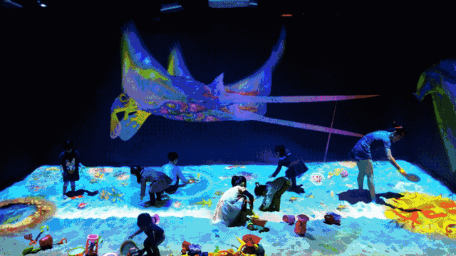 一款由互動桌涂色卡、彩筆、掃描儀、投影墻組成的兒童繪畫交互多媒體裝置。墻面將投射海洋的畫面,孩子們可以使用入的涂色卡上色。繪畫作品完成后,通過掃描儀識別,或者觸摸屏甩屏,小朋友們能夠看到自己創(chuàng)作的小動物出現(xiàn)在墻面投影世界中。此外,小朋友們還能與自己完成的繪畫作品中的動物進行有趣的互動。