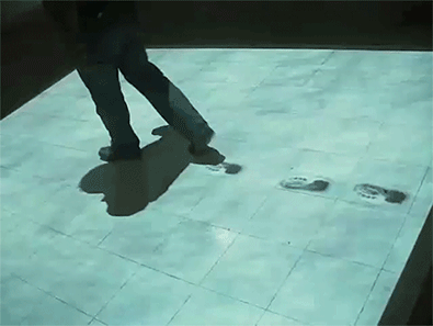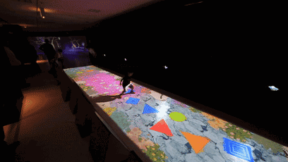 由一塊長方形顯示器和投影組成的動態(tài)地面。投影儀將圓圈、三角形、正方形等符號投影在地面上。孩子們跳落在這些形狀的符號上時就會發(fā)出聲音,并出現(xiàn)不同的顏色。