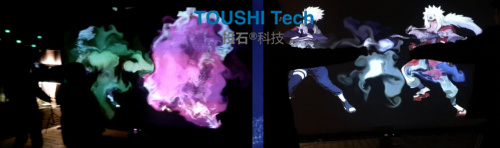 支持雙人體感互動(dòng),可以自行插入動(dòng)漫圖案,形成雙人PK的酷炫感覺。不同體驗(yàn)者將生成不同顏色的煙霧波發(fā)射出去。支持任意PNG圖片植入進(jìn)行互動(dòng)PK。