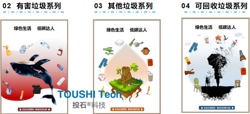 這款產(chǎn)品分為4個系列:餐廚垃圾分類、可回收物分類、有害垃圾分類、其他垃圾分類。