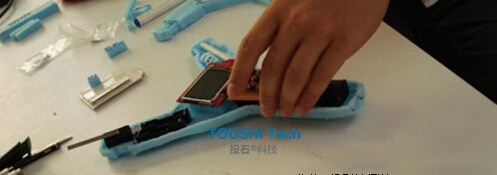 這個彈弓里面包含有一個手機(jī)模組,可以用于短信編寫、顯示和發(fā)送,激光燈用于發(fā)射的定向,另外還需要有一臺電腦和投影機(jī)進(jìn)行配合,電腦用于接收短信,經(jīng)過投石軟件的處理讓其可以呈現(xiàn)出動畫效果,然后還需要有機(jī)械裝置判斷用戶的發(fā)射動作,這時電腦會同步送出短信被彈出的動態(tài)效果,投影機(jī)就能在墻體上放出畫面。