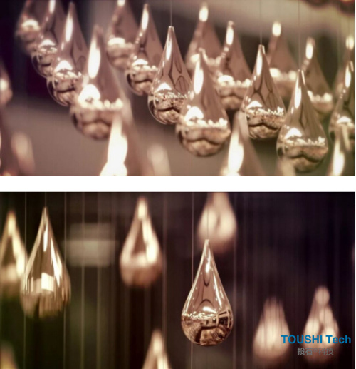 每顆空心的水滴重180克,用鋁制成,外層鍍上拋光紫銅,可防氧化或被銹蝕。從最上方到最底部,水滴流過7.3米的距離。