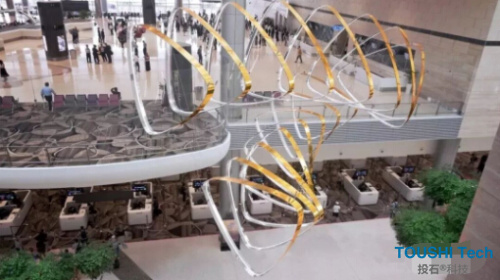 新加坡樟宜機(jī)場(chǎng)4號(hào)航站樓的中心裝飾物“云彩之曲”是一個(gè)巨型動(dòng)力雕塑作品。由六個(gè)橫跨中央廣場(chǎng)的懸掛結(jié)構(gòu)(總長(zhǎng)200米)組成,從離境登機(jī)大廳、過境區(qū)和抵達(dá)大廳都可以看到此裝飾。