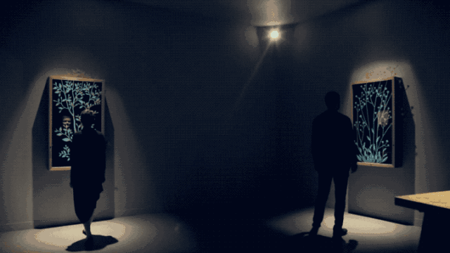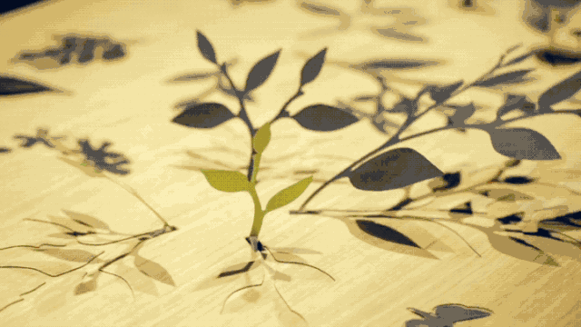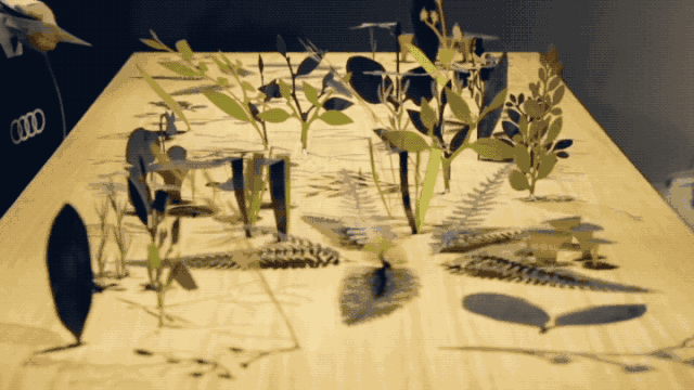 害羞植物裝置由一張橡木桌子和兩面鏡子組成,裝飾著葉子,花朵和昆蟲,根據(jù)游客的行為出現(xiàn)或消失。當人們在附近時,桌子上的樹葉和昆蟲會緩緩向桌面貼合,但是一旦它們移開就會升起。