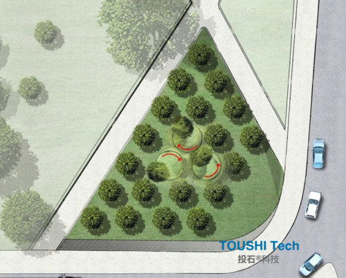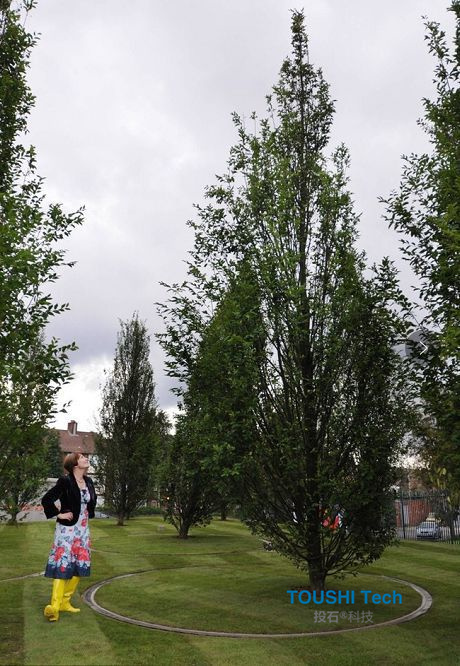 在英國的一個公園的轉(zhuǎn)角處有一片樹林,其中三棵樹對應的草皮用標準的圓形輪廓區(qū)別出來,并配置有按鈕,這是干什么的呢?