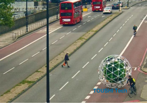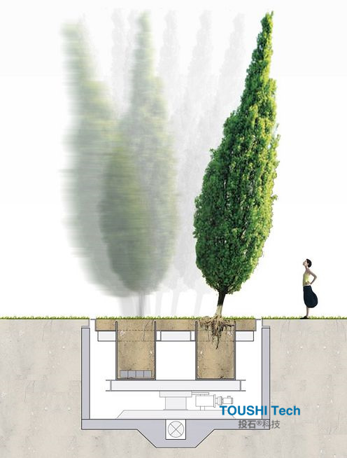 原來,只要輕輕按下按鈕,圓圈內(nèi)的樹就會緩緩轉(zhuǎn)動起來,樹枝和樹葉也會隨著轉(zhuǎn)動的節(jié)奏開始搖擺,就像輕盈的舞者,為路過的行人翩然起舞,為這城市靜止的空間添加一份生機,令風和云,天光和草木都不禁動容。