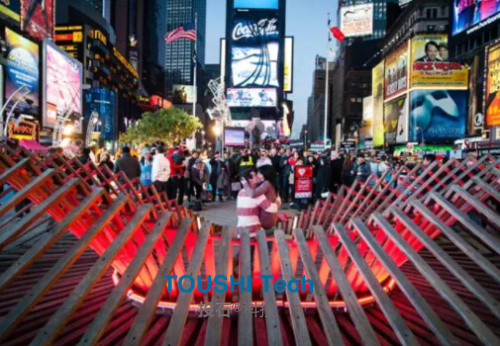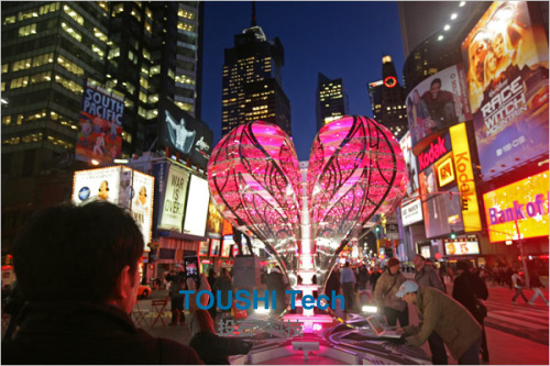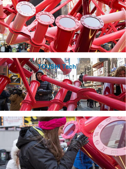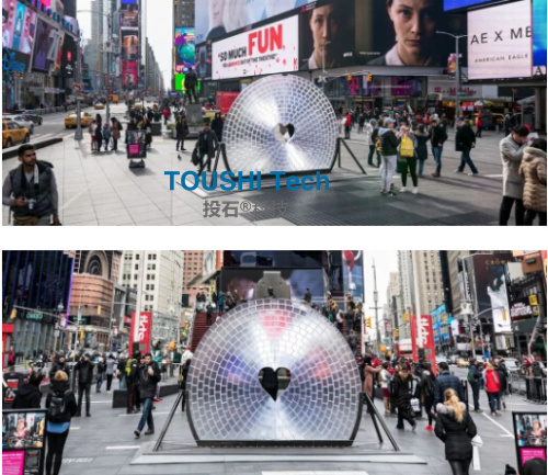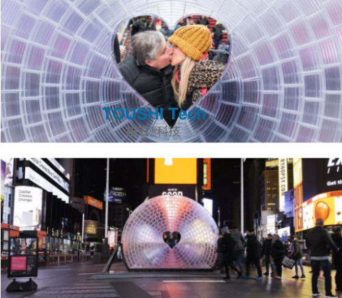 在光影下,“心靈之窗”可以扭曲和捕捉時代廣場的圖像,從這里看到的一切都是心形的。 360度無死角接吻攝像機裝置