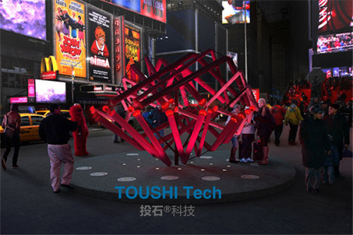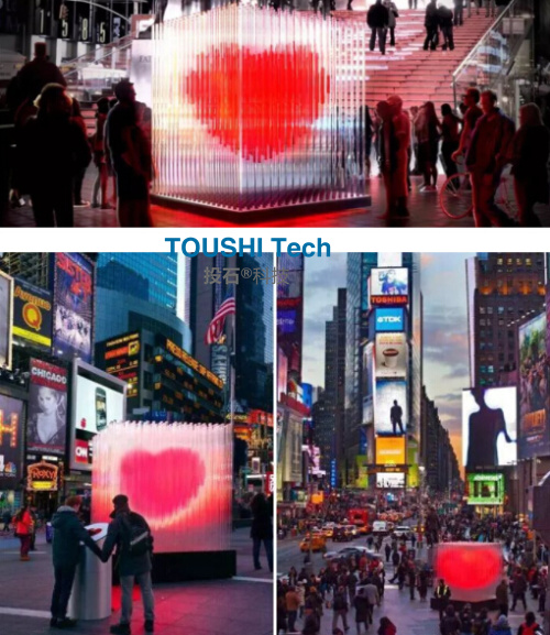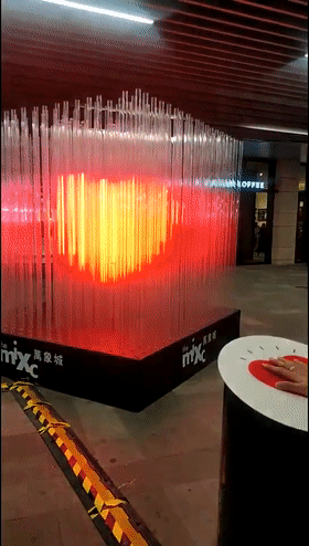 這款透明的立方體發(fā)光雕塑裝置,它高3米,由400根透明的亞克力管內嵌led燈形成一個在風中搖曳跳動的紅心,當人們觸摸心形雕塑一旁的傳感器,心就會變得更亮,就像心臟一樣跳動。