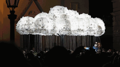 當人經過玫瑰下方時,花蕊處的感應器便會探測到,從而使花朵綻開。當人離開一段時間后,花朵又會慢慢收起,與玫瑰互動~營造浪漫氛圍。 點亮云朵裝置