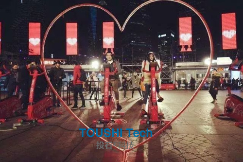 發(fā)電單車由4輛單車,一塊心形墻,電線連接組成。互動方式:通過踩踏單車點亮愛心。