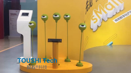 眼球控制:“看得見”的高科技。這個(gè)互動(dòng)裝置每5個(gè)一組,每個(gè)高度不同,利用Kinect技術(shù),眼球操控設(shè)備。你走哪它看哪,一雙雙眼睛無時(shí)無刻不盯著你的一舉一動(dòng)。 物體識(shí)別觸摸桌