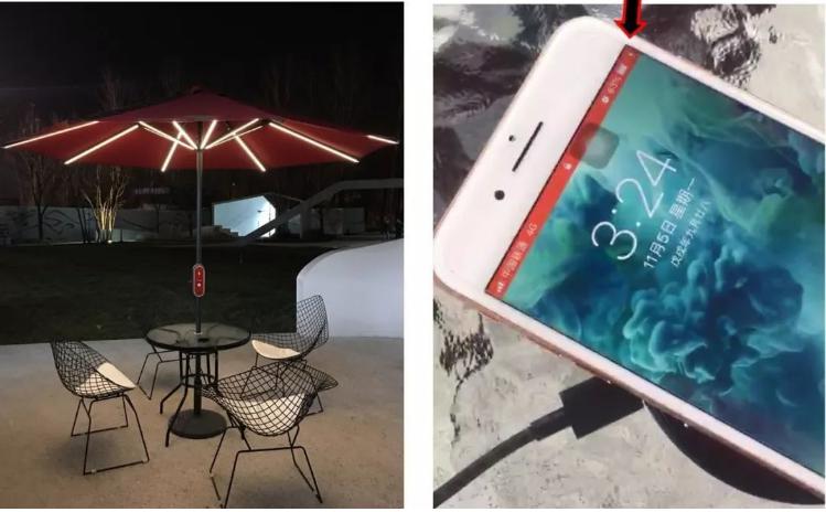 太陽能傘利用最新“薄膜發(fā)電”技術(shù),12W大功率柔性薄膜太陽能芯片產(chǎn)生的電能,可同時給10部手機(jī)“無線充電” 智能水簾可以實時報時間