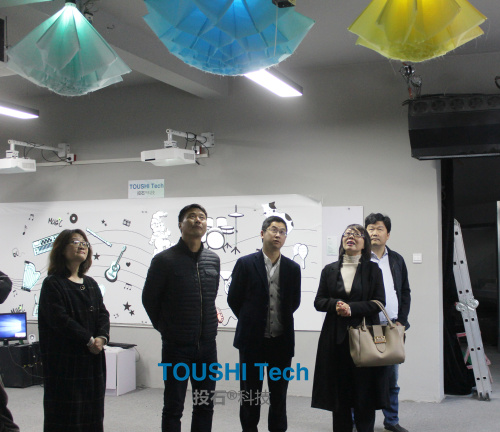 孫峰峰總經理向來訪嘉賓介紹了公司的故事販賣機、花傘、未來之眼魔法眼鏡、魔法音樂觸摸墻、聲音郵局、企鵝矩陣、體感二次元等展項。