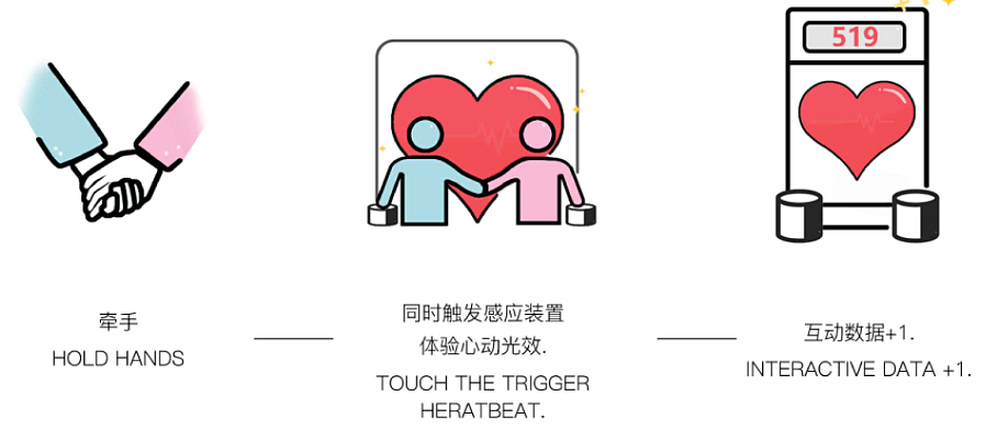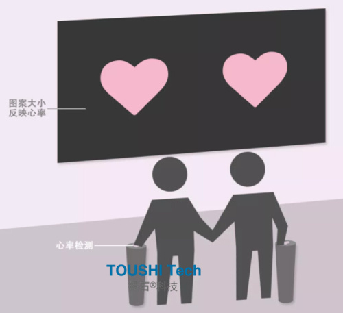 通過互動式燈光游戲方式來與與陌生人“心靈相通”。兩位或以上的觀眾可以將手放在手形圖案上方,借助心跳傳感器,用心跳實(shí)時控制LED彩燈;若有兩人以上的心跳在同一頻率,心形大屏幕會給您驚喜。