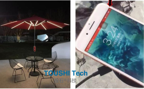 太陽能傘利用最新“薄膜發(fā)電”技術,12W大功率柔性薄膜太陽能芯片產生的電能,可同時給10部手機“無線充電” 智能水簾可以實時報時間