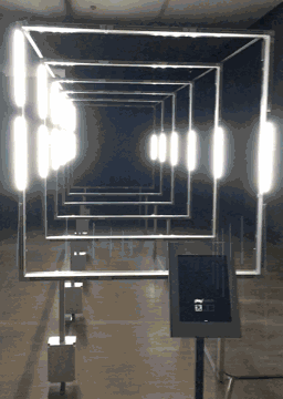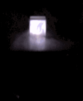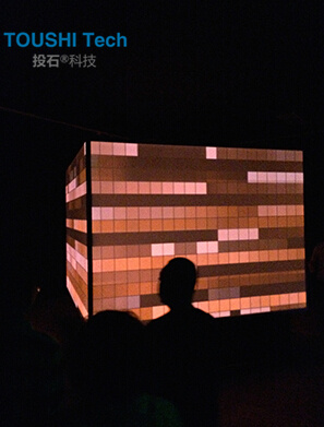 在一個(gè)暗室當(dāng)中,觀眾可以通過(guò)麥克風(fēng)等捕獲器,根據(jù)周?chē)寺曨l率、音色和音量高低,立方體會(huì)顯示大小、顏色不同的色塊,在發(fā)光的立方體上與作品互動(dòng)。