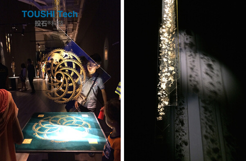 左邊是需要用耳機(jī)作展示的“建筑聲音”裝置,右邊是通過(guò)觸摸來(lái)顯示聲音和光的“獨(dú)塊巨石”,都是奇妙的人與聲音、物體的互動(dòng)與聯(lián)結(jié)。