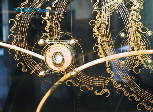 《此時(shí)此地》由74個(gè)玻璃板組成,其中60個(gè)可以發(fā)出聲音。事實(shí)上,這些玻璃板是“玻璃擴(kuò)音器”,通過(guò)32個(gè)擴(kuò)音器與16個(gè)鉑金CD相連。