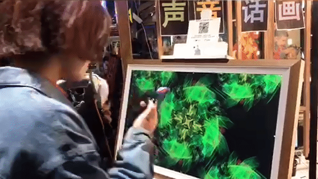 一款用聲音來(lái)畫(huà)畫(huà)的裝置,想想都覺(jué)得妙哉。該裝置利用了聲音的屬性找到了對(duì)應(yīng)介質(zhì),在麥克風(fēng)捕捉到環(huán)境音的情況下,與人聲連結(jié)再基于聲音的交互形態(tài)呈現(xiàn)成了我們以上所看到的色彩迷幻的畫(huà)面。