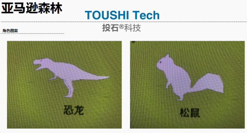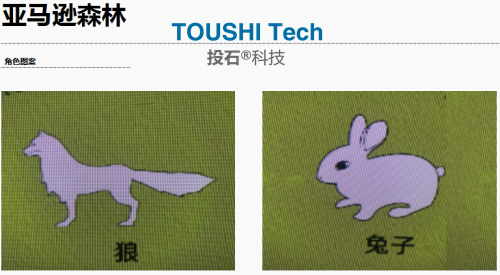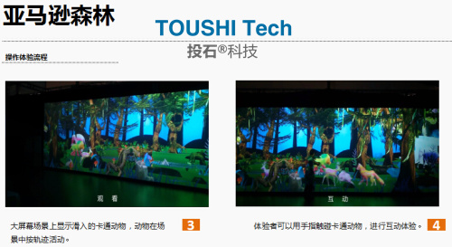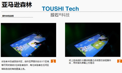 2.體驗者通過對固定圖案上色、上傳喜歡的動物到亞馬遜熱帶森林并能與這些動物互動。 投石智能系統(tǒng)亞馬遜森林操作體驗流程: