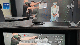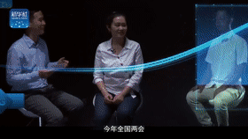 這是全國人大代表程桔在錄制訪談,異地同屏呈現(xiàn),“真人”就在眼前,全息成像技術(shù)利用干涉和衍射原理,記錄并再現(xiàn)物體真實(shí)影像,營造亦真亦幻的觀賞效果。將北京演播室和武漢、廣州、昆明的攝影棚“無縫銜接”,虛擬與現(xiàn)實(shí)在這里融為一體。